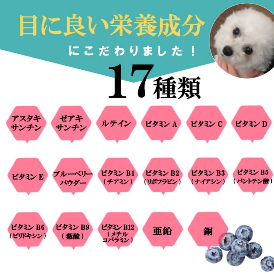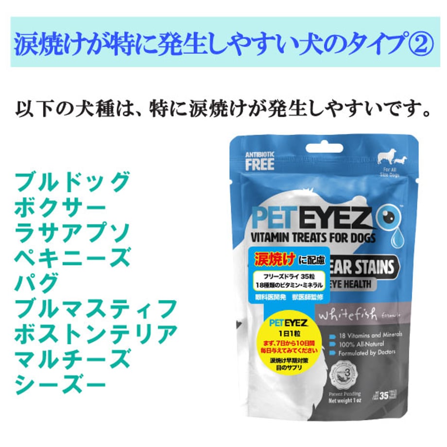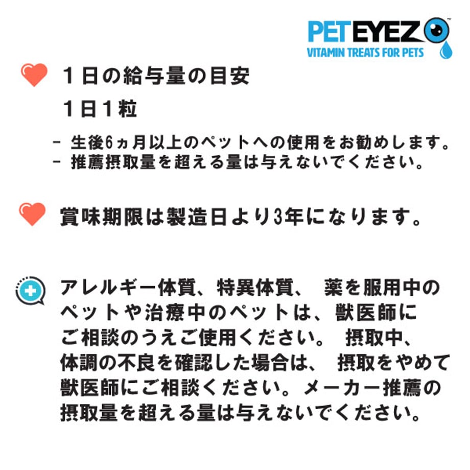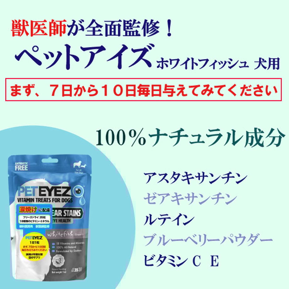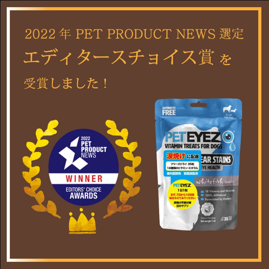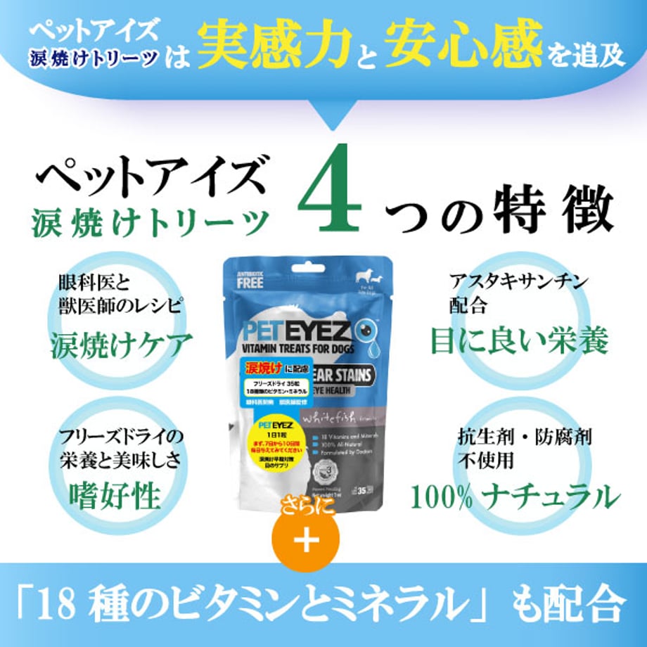 目の健康維持・涙やけ、ドライアイに配慮。網膜や身体への栄養分供給。30年経歴の眼科医開発・獣医師監修。18種類のビタミンとミネラル配合の目のサプリメントトリーツ。フリーズドライで嗜好性抜群の全米話題のペット用サプリメントトリーツ。