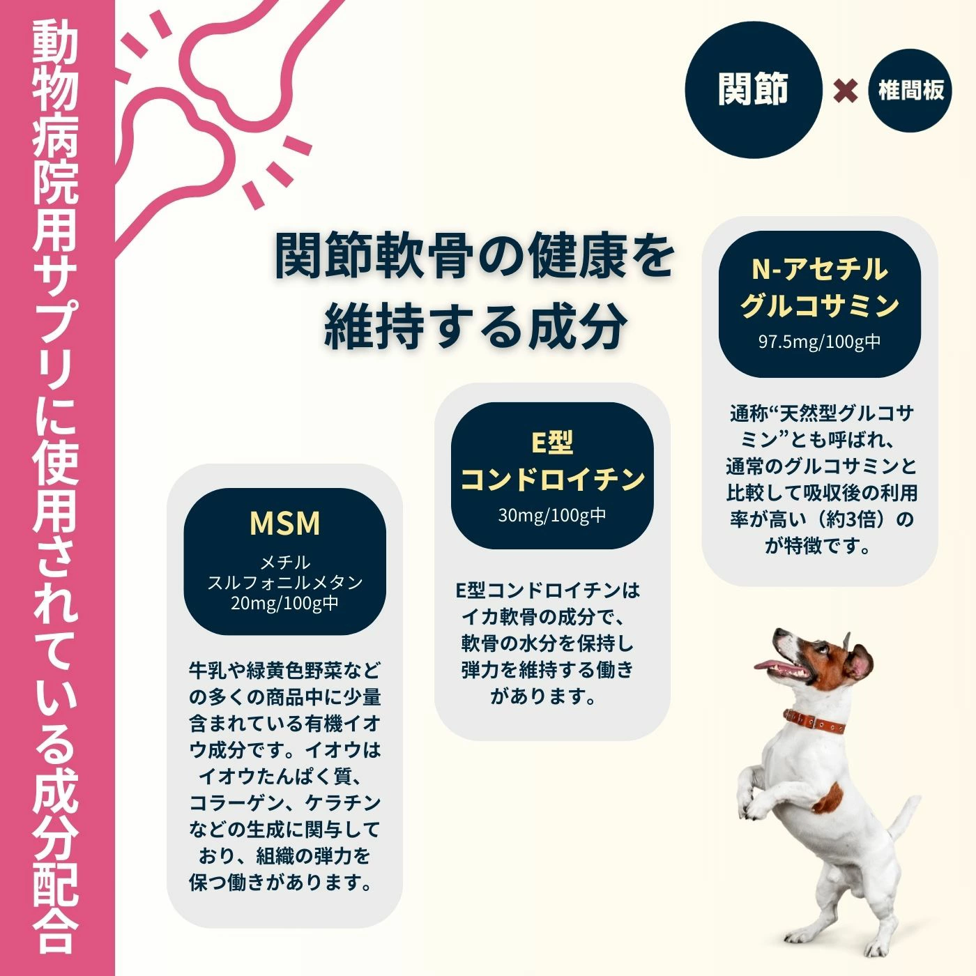 Method Dog(メソッドドッグ)スマイリーアクティブケアは実際の獣医療現場で使用され、実績のある機能性原料を配合。スマイリーシリーズならではの究極かつ本物思考型機能性シリーズです。愛犬の首(頸椎)から腰(腰椎)までの椎間板、関節の健康維持におススメです。DHA&EPAを含有した国産マグロ肉を使用しています。
