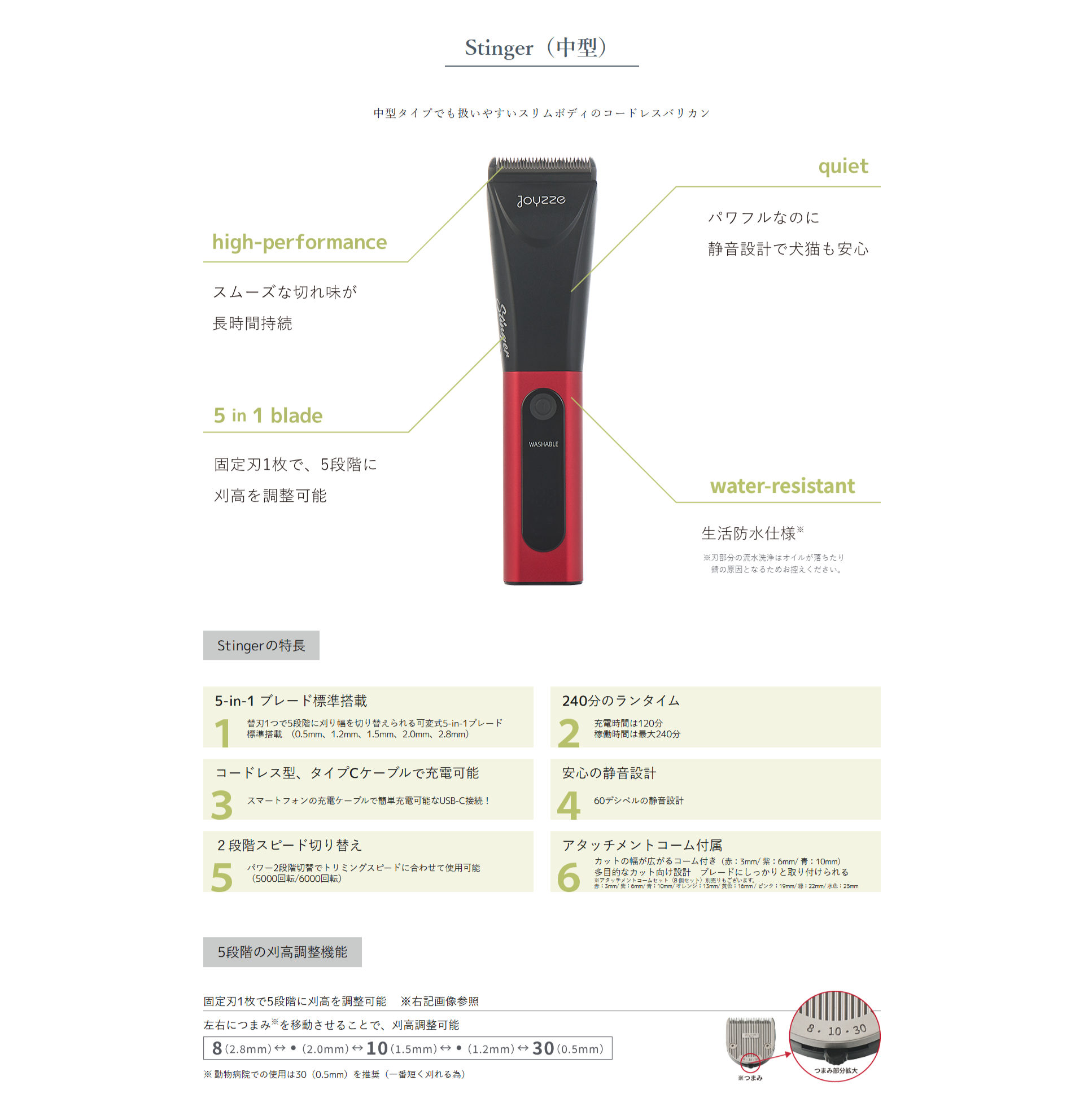 海外製バリカンやコードレスバリカン初心者の方でも扱いやすく、5段階切り替え可能な標準刃と3種類のアタッチメントが付属されており、使い方のバリエーションも豊富です。