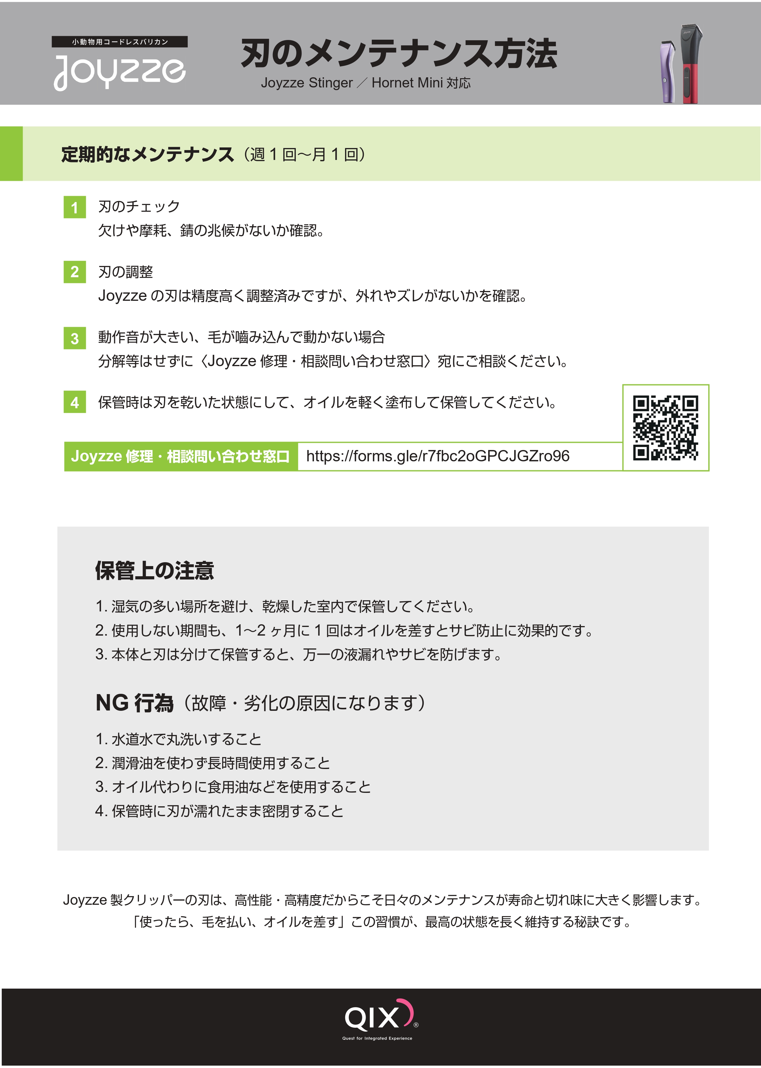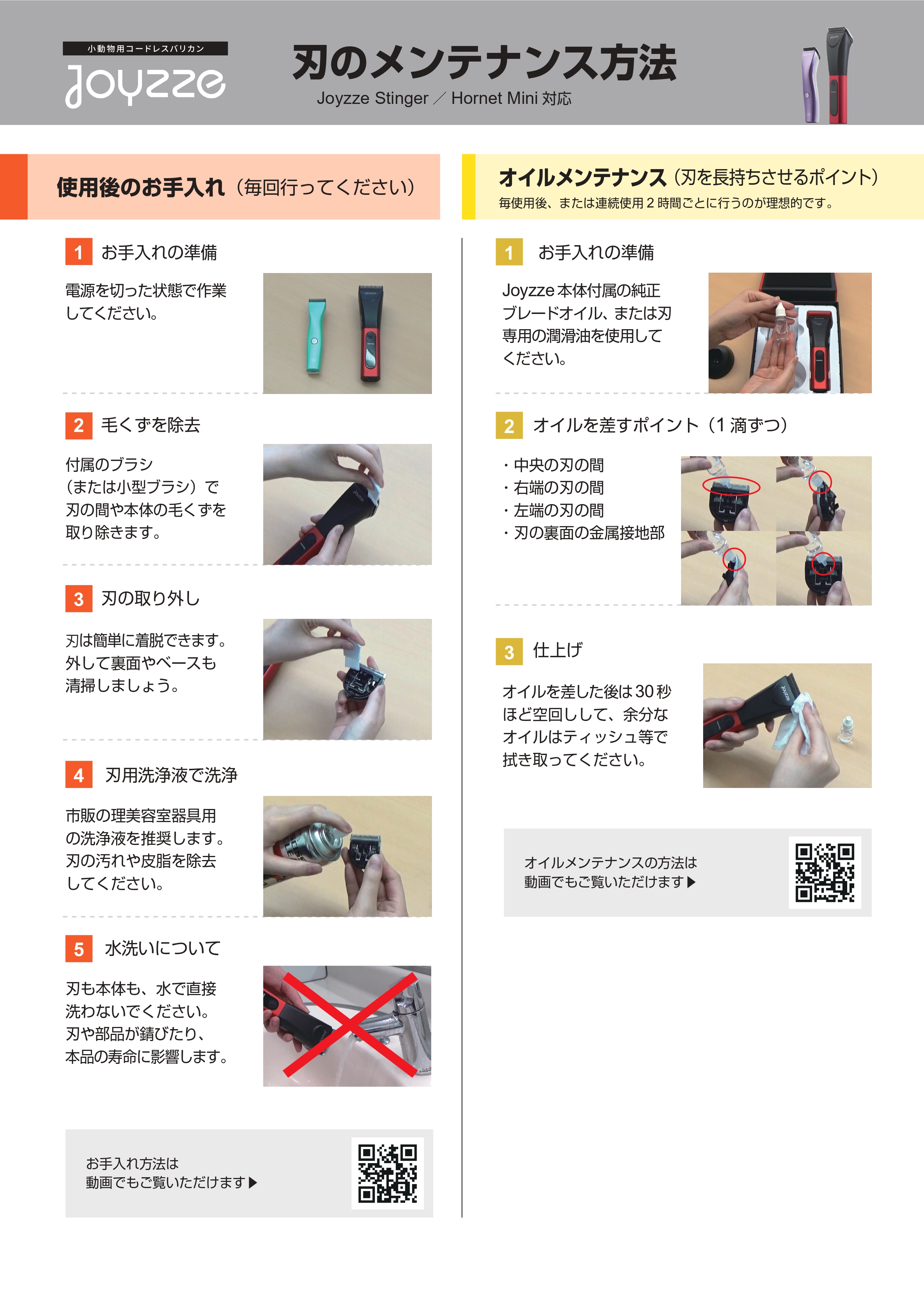 1.クリッパーを差し込んだまま放置しないでください。 2.Joyzzeが推奨していないアタッチメントは使用しないでください。 3.コードまたはプラグが損傷している場合、正常に機能していない場合、落とした場合、または液体に浸した場合は、 このクリッパーを使用しないでください。販売店にご連絡ください。 4.このクリッパーで延長コードを使用しないでください。 5.コードを加熱された表面から離してください。 6.製品が濡れた状態で使用しないでください。 7.この製品は、 動物のグルーミングのみを目的としています。 8.屋内使用のみ。 可燃性ガスが使用されている場所では使用しないでください。 9.怪我を避けるために:損傷または破損した刃でこのバリカンを使用しないでください。 10.接続を外すには:クリッパーの電源をオフにしてから、 コンセントからプラグを抜きます。 11.充電には、 Joyzze が提供する充電台のみを使用してください。 12.子供の手の届かないところに保管してください。 13.本製品の電池は交換できません。 14.製品を廃棄する前にバッテリーを取り外してください。 15.バッテリーは適切かつ安全に廃棄してください。 |