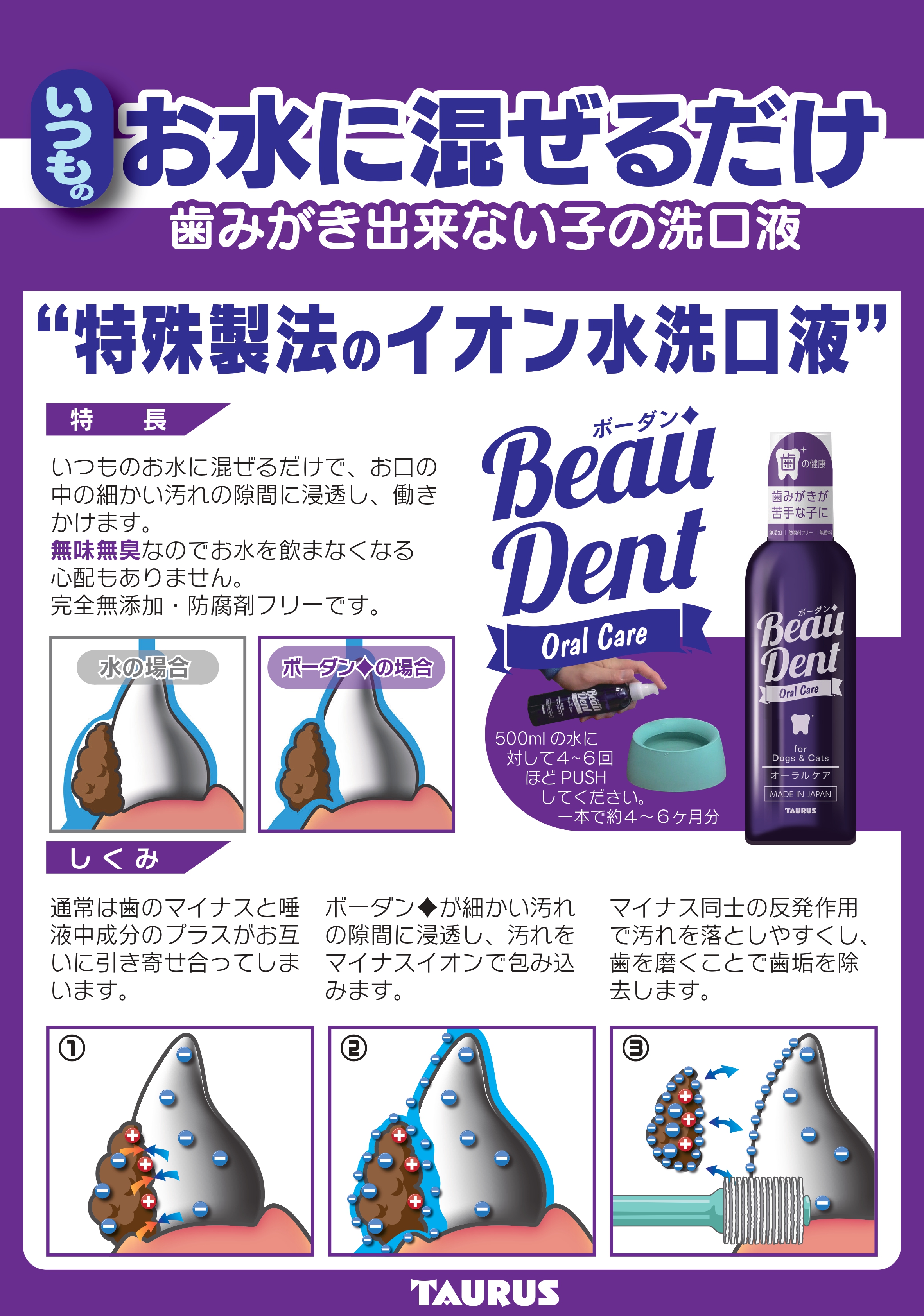 いつものお水に混ぜるだけ。特殊製法の還元性イオン水が歯の汚れをマイナスイオンで包み込みマイナス同士の反発作用で落としやすくし、歯を磨くことで歯垢を除去します。