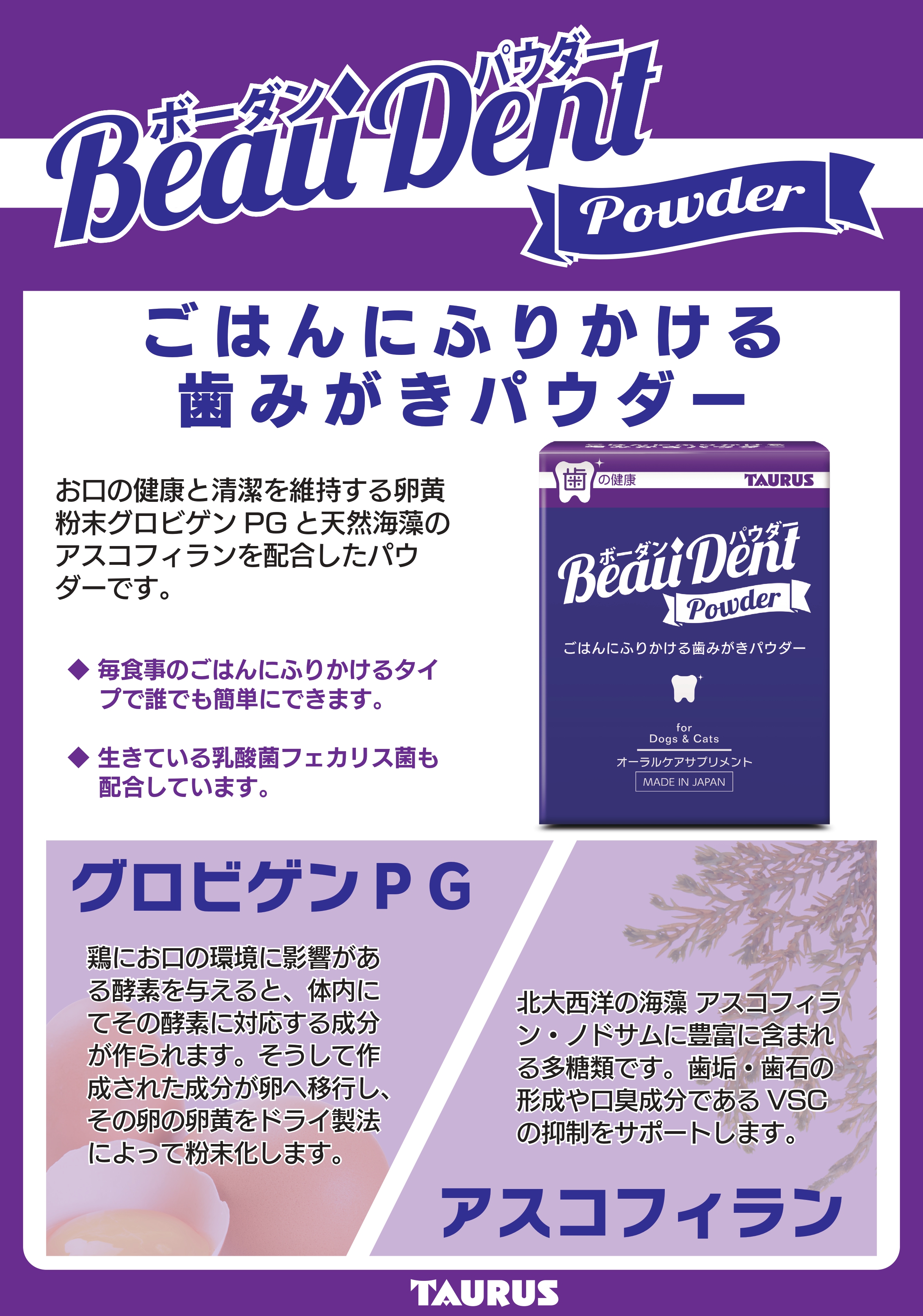 お口の健康と清潔を維持する卵黄粉末グロビゲンPGと天然海藻のアスコフィランを配合したパウダーです。