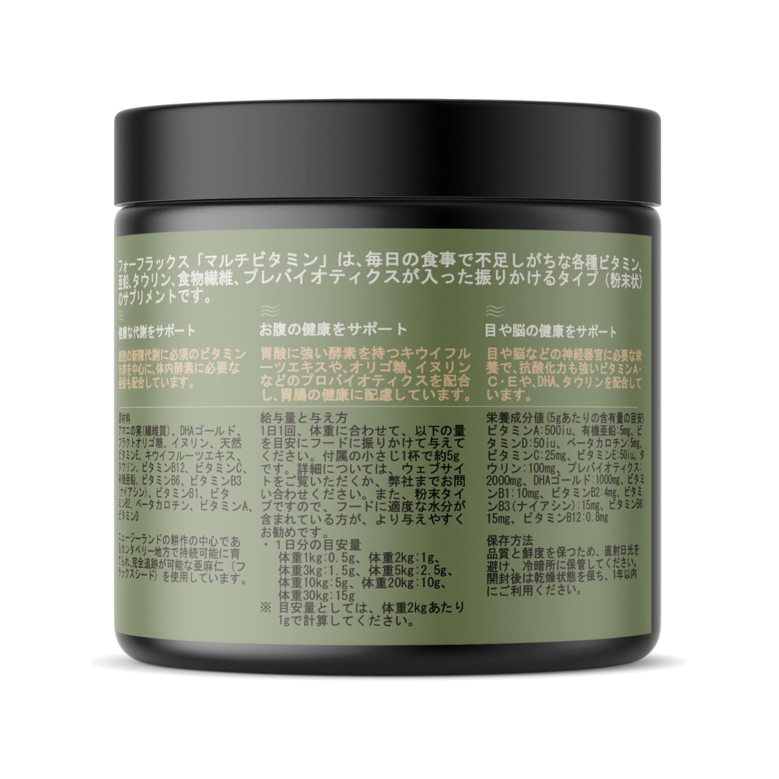 | 給与量 | 1日1回、体重に合わせて、以下の量を目安に、フードに振りかけて与えてください。 ・体重1kg:0.5g、2kg:1g、3kg:1.5g、5kg:2.5g、10kg:5g、20kg:10g、30kg:15g /1日分 |