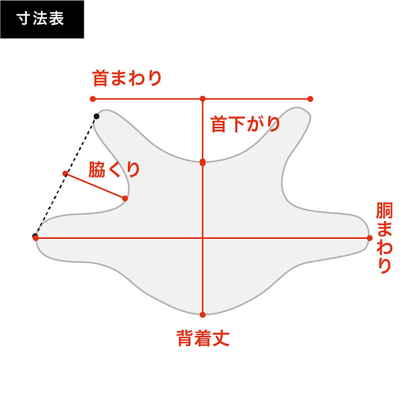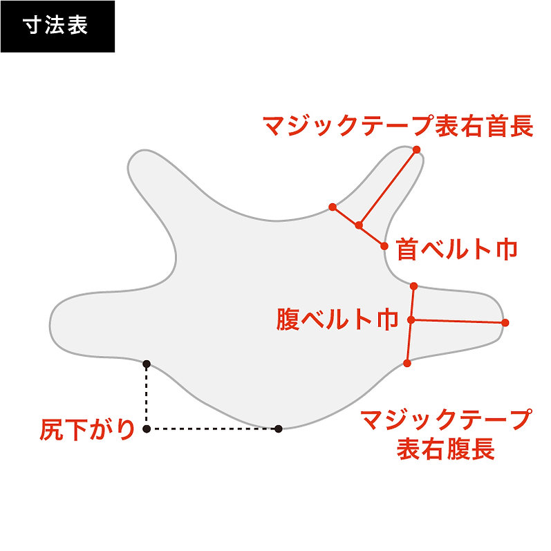 M 総着丈:33 胴まわり:50〜60 首まわり:36〜44 L 総着丈:44 胴まわり:64〜75 首まわり:44〜60 XL 総着丈:55 胴まわり:74〜85 首まわり:55〜70 |