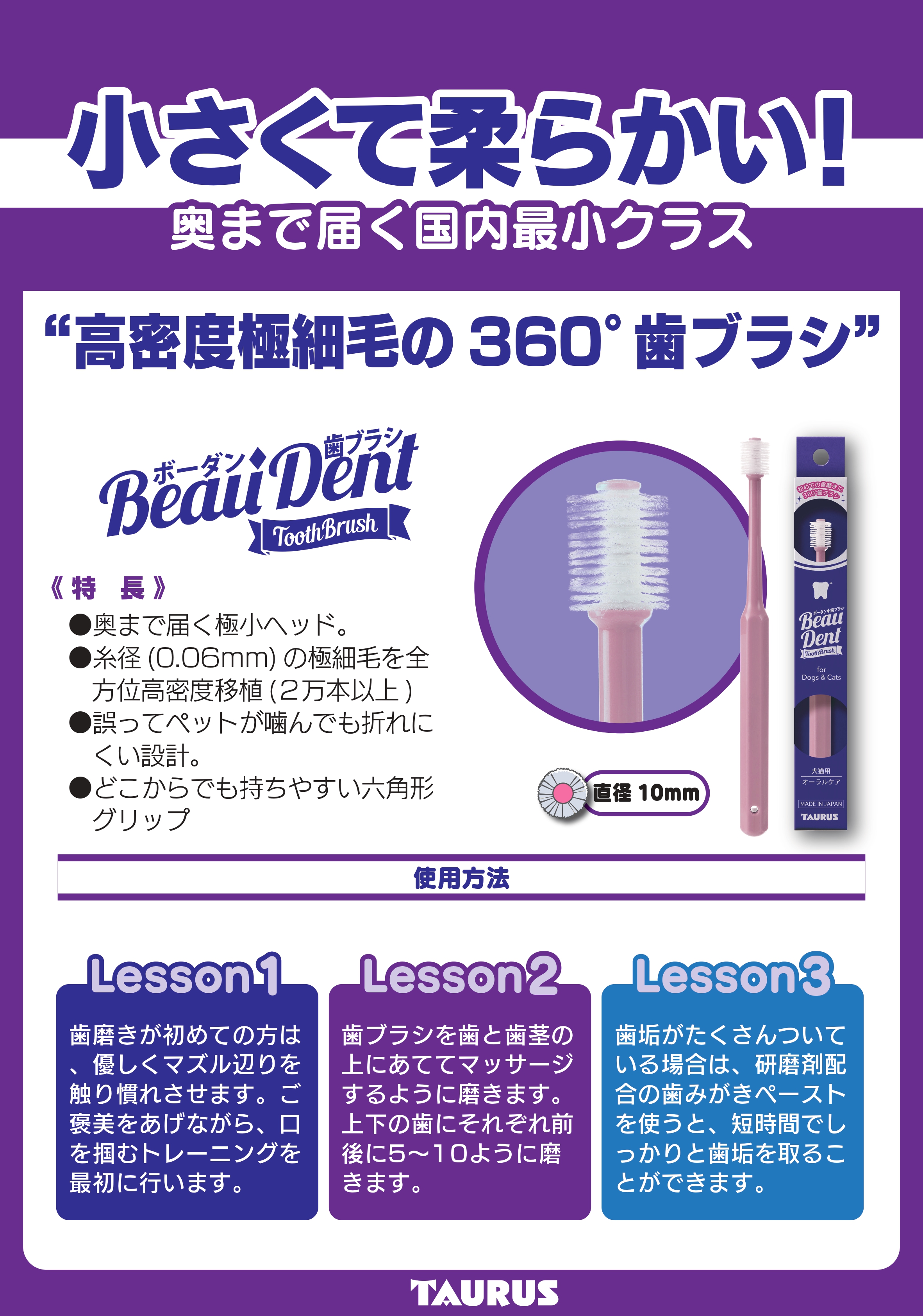 | 使用方法 | ・歯磨きが初めての方は、優しくマズルを触り慣れさせます。ご褒美をあげながら、口を掴むトレーニングを最初に行います。 ・歯ブラシを歯と歯茎の上にあててマッサージするように磨きます。 ・上下の歯に対し、それぞれ前後に5~10回くらい磨いてあげてください。 ・歯垢がたくさんついている場合は研磨剤配合の歯みがきペーストを使うと、短時間でしっかりと歯垢を取ることができます。 |