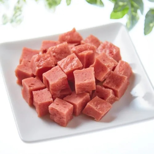 - 小型犬やシニア犬にも食べやすいひと口サイズの角切り仕上げ。