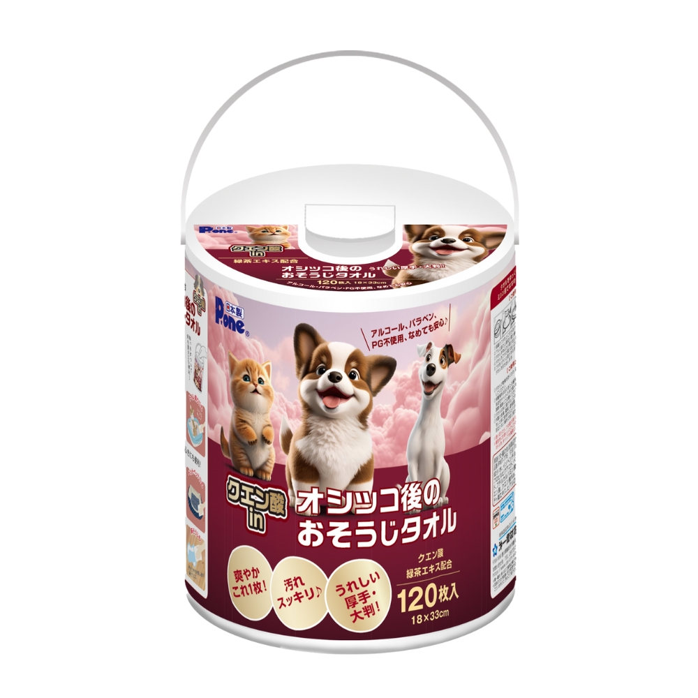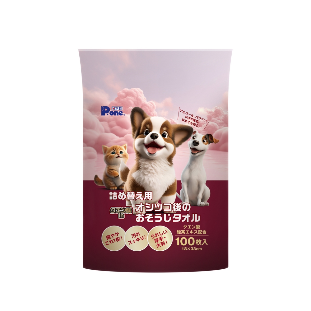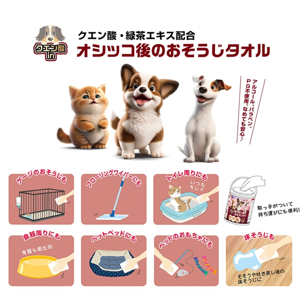 クエン酸、緑茶エキス配合。弱酸性のクエン酸がアルカリ性のおしっこ臭にも効果的。これ一枚でオシッコ汚れスッキリ!厚手で大判サイズの大容量おそうじタオル。