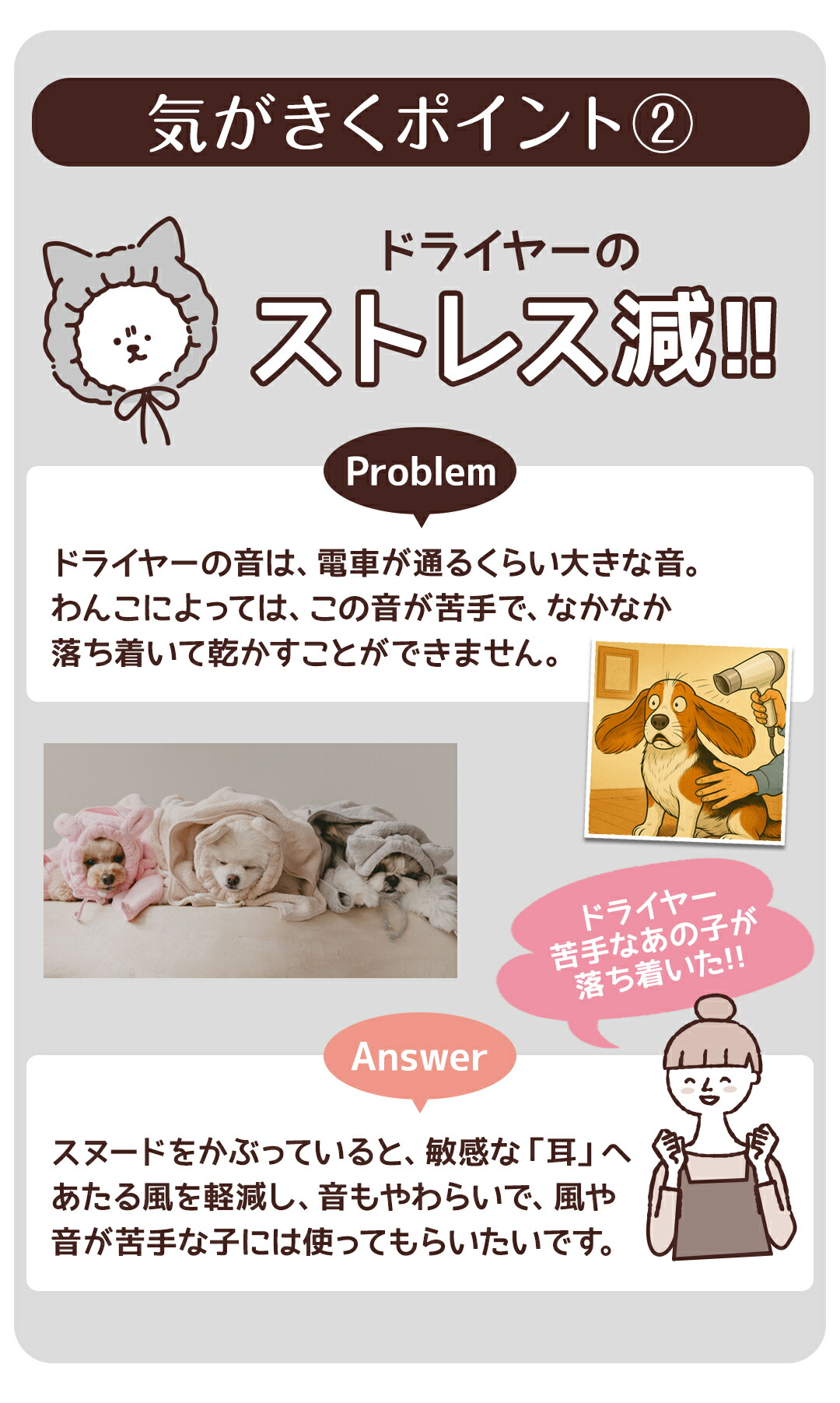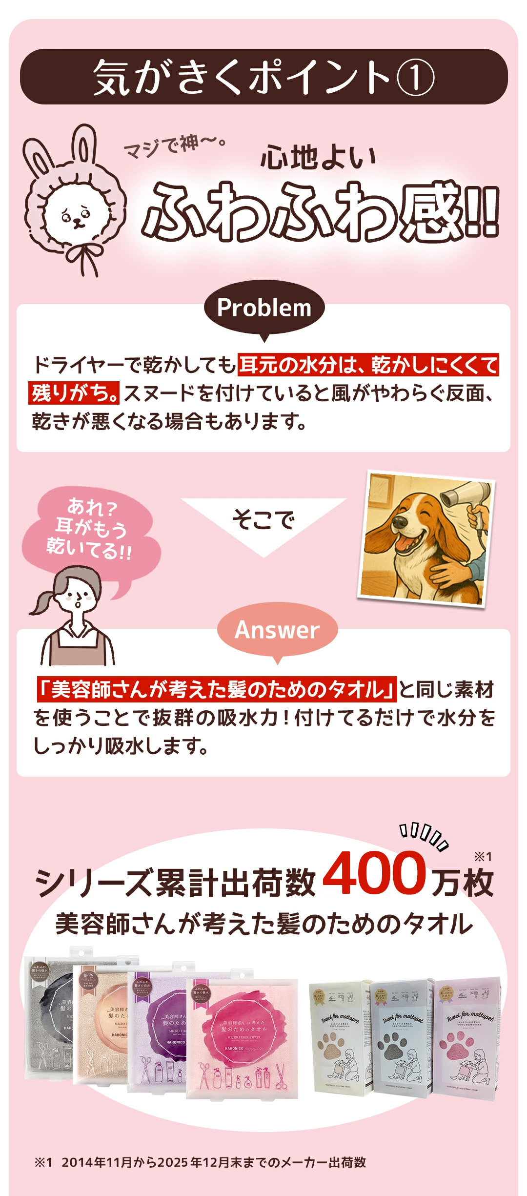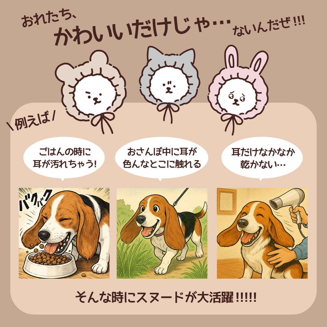 ヘアケアメーカーハホニコ発想!シリーズ販売累計350万枚突破の「美容師さんが考えた髪のためのタオル」シリーズから生まれたかわいいペットスヌード!こだわりのカットパイル×抜群のふんわり感×吸水力!