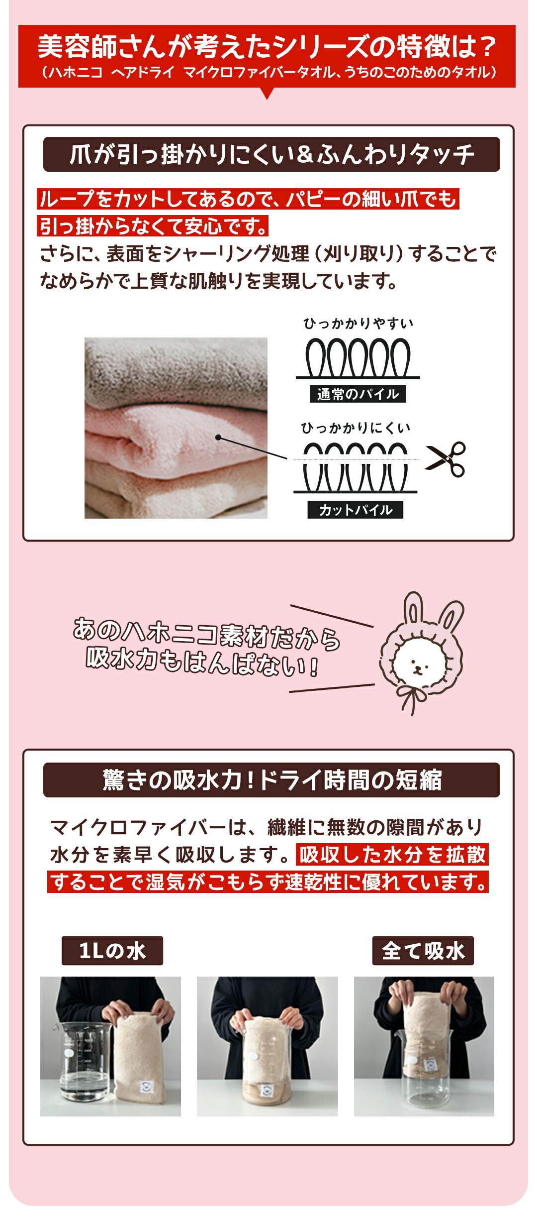 タオルが爪などに引っかかる感触の原因の一つはタオルの織りかたです。通常織りあがったタオルは両面ともにパイル状になっている為、引っ掛かりやすいのに対し、【カットパイル】は表面をシャーリング(刈り取る)しているので上質感あふれるなめらかな肌触り。一般的なタオルと異なり、爪などにひっかかりがないカットパイル仕上げが特長です。 ゴシゴシと拭かなくても、ふんわりなめらかな肌触りで傷つきやすい濡れた体(被毛)をやさしく包み込み、摩擦で生じるキューティクルの剥離や、角質への負担を軽減します。
