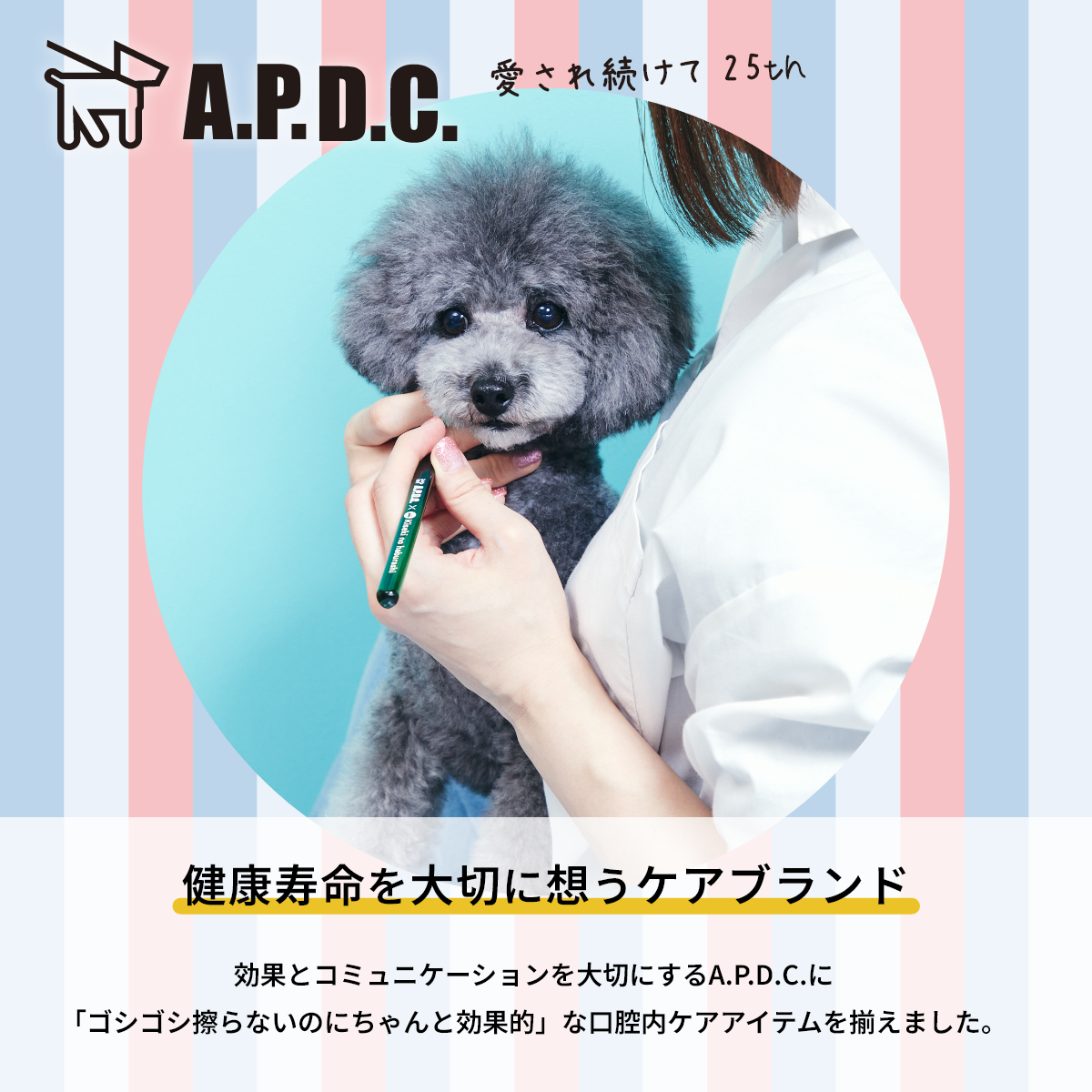 人用歯ブラシの形に革新的な変化を起こした「奇跡の歯ブラシ」との共同開発で、ペット用がA.P.D.C.ブランド独占販売で登場いたしました。歯ブラシの専門家とペットの専門家が犬の為に開発した極上の歯ブラシです。