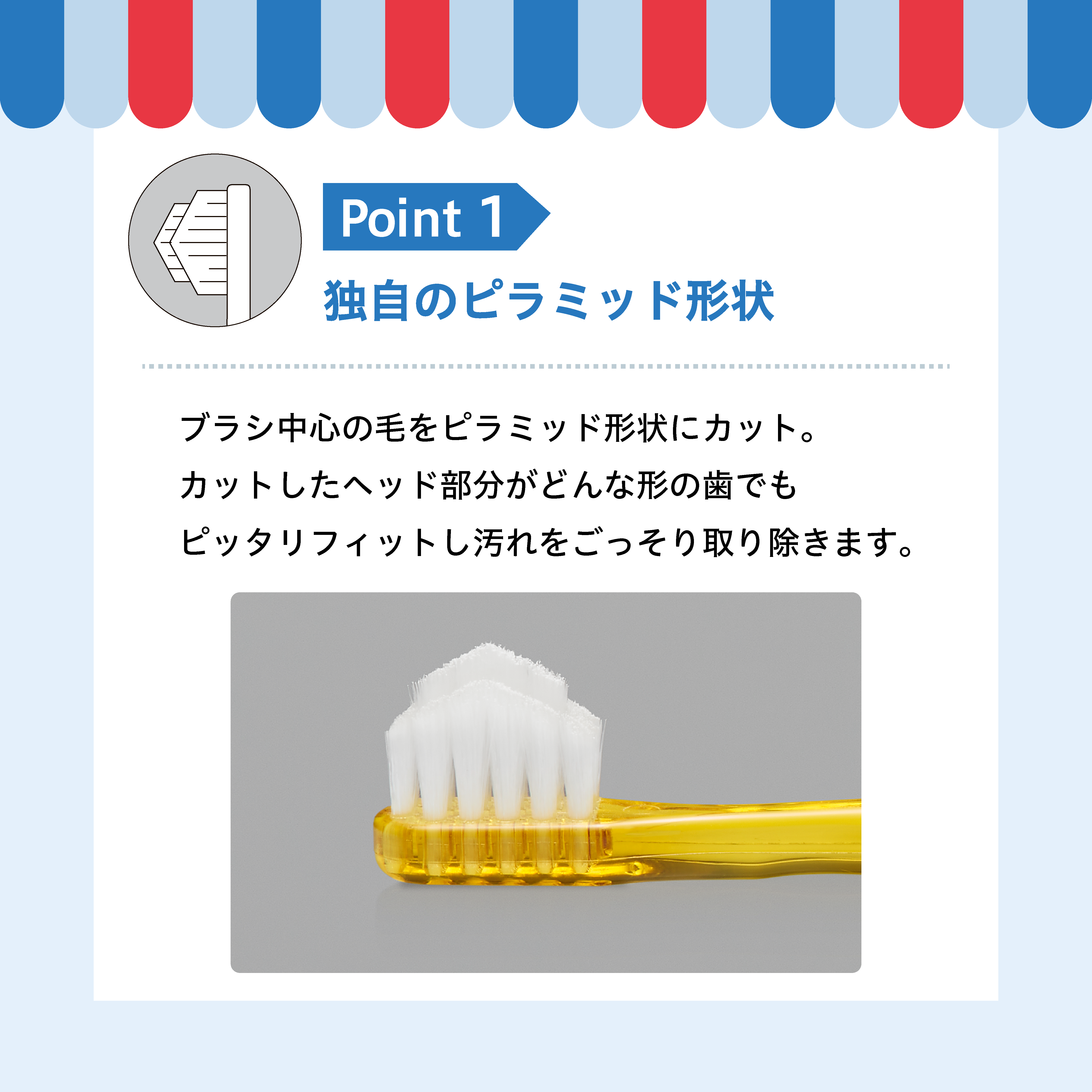 ブラシ中心の毛をピラミッド形状にカット。カットしたヘッド部分がどんな形の歯にでもピッタリフィットし汚れをごっそり取り除きます。