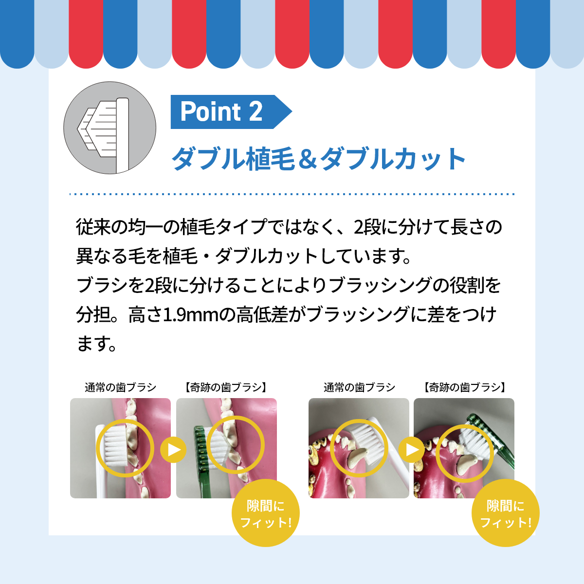 従来の均一の植毛タイプではなく、2段に分けて長さの異なる毛を植毛・カットしています。ブラシを2段に分けることによりブラッシングの役割を分担。高さ1.9mmの高低差がブラッシングに差をつけます。