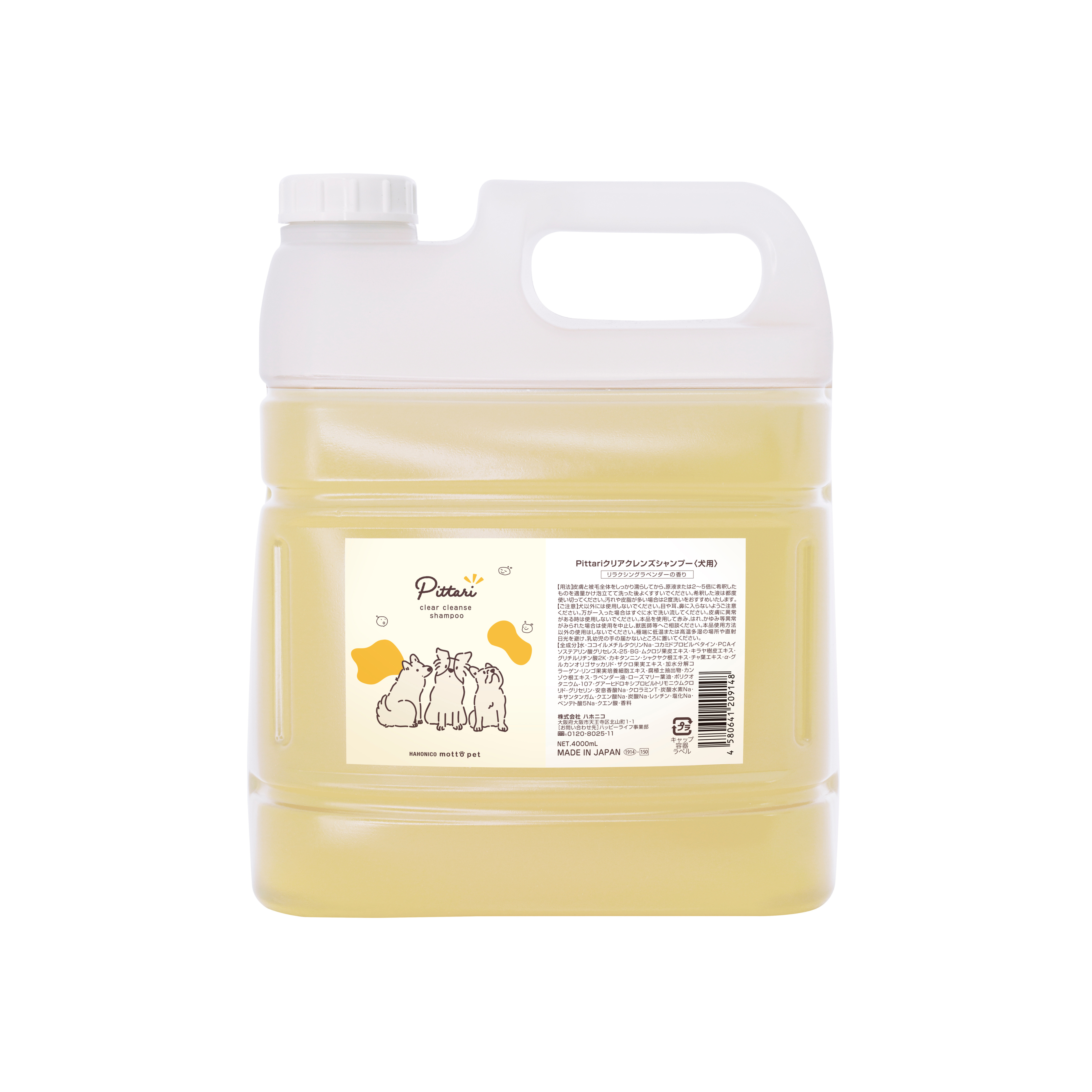 | 使用方法 | 皮膚と被毛全体をしっかり濡らしてから、原液または2~5倍に希釈したものを適量かけ泡立てて洗った後よくすすいでください。希釈した液は都度使い切ってください。汚れや皮脂が多い場合は2度洗いをおすすめいたします。 |