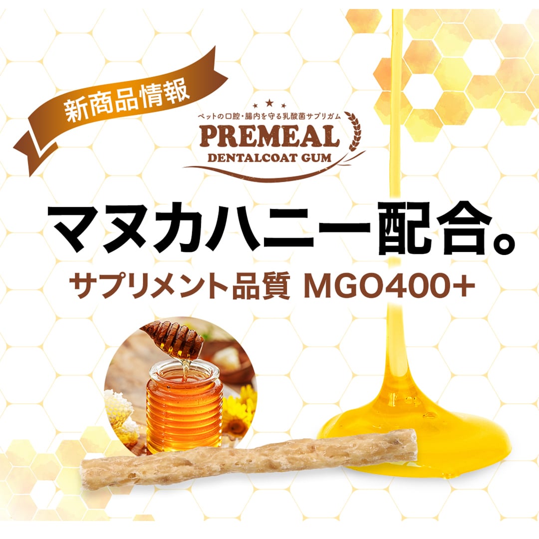 PREMEAL デンタルコートガム Umanuka は低アレルゲン素材として人気の国産馬皮ガムに、ニュージーランド産MGO400+グレードのマヌカハニーと乳酸菌を組み合わせたPREMEALシリーズの新しいデンタルケアガムです。