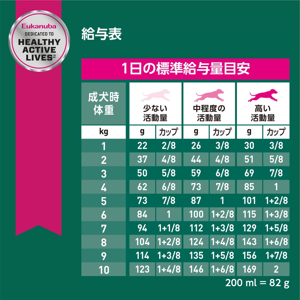 素材 原材料:肉類(鶏、七面鳥)、とうもろこし、小麦、大麦、動物性脂肪、ビートパルプ、加水分解レバー(鶏、七面鳥)、魚油(DHA源)、フラクトオリゴ糖、グルコサミン、加水分解軟骨(コンドロイチン硫酸源)、アミノ酸類(L-カルニチン)、ポリリン酸ナトリウム、ミネラル類(Cl、Na、Ca、K、Zn、Mn、Fe、Cu、I、Se)、ビタミン類(A、D3、コリン、E、パントテン酸カルシウム、ナイアシン、B6、B1、B2、ビオチン、葉酸、B12)、保存料(ソルビン酸カリウム)、酸化防止剤(ミックストコフェロール、ローズマリーエキス) 成分(保証分析値): たんぱく質  27.0 %以上、 脂質  8.0 %以上、 粗繊維  3.3 %以下、 灰分  6.6 %以下、 水分  9.0 %以下、 食物繊維  10.9 % ビタミン(1kg中): A  17500 IU/kg、 D3  1100 IU/kg、 E  320 mg/kg カロリー含有量(代謝エネルギー):366kcal/ 100g