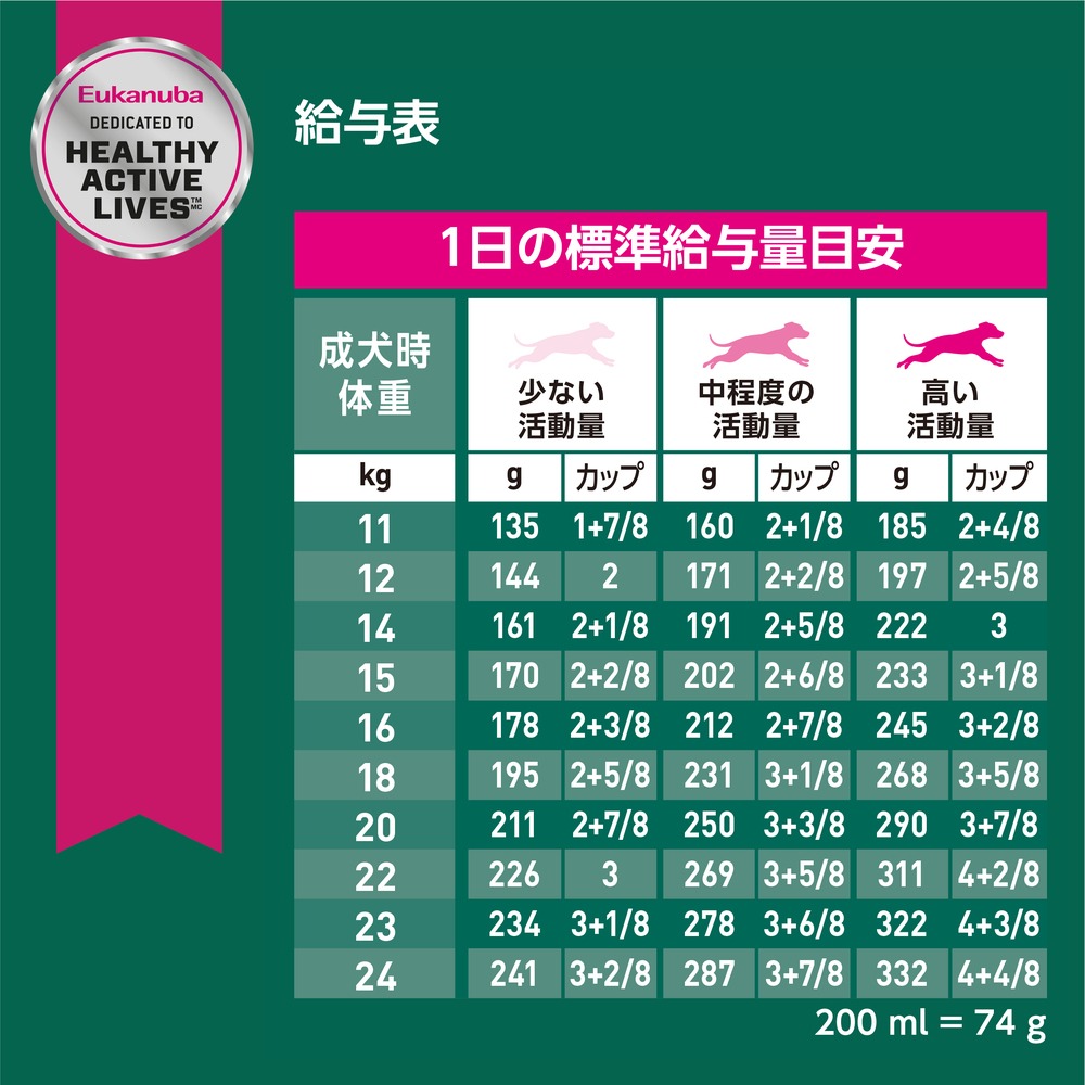 素材 原材料:肉類(鶏、七面鳥)、とうもろこし、小麦、大麦、ビートパルプ、動物性脂肪、加水分解レバー(鶏、七面鳥)、魚油(DHA源)、フラクトオリゴ糖、グルコサミン、加水分解軟骨(コンドロイチン硫酸源)、アミノ酸類(DL-メチオニン、L-カルニチン)、ポリリン酸ナトリウム、ミネラル類(Cl、Na、Ca、K、Zn、Fe、Mn、Se、Cu、I)、ビタミン類(A、D3、コリン、E、パントテン酸カルシウム、ナイアシン、B6、B1、B2、ビオチン、葉酸、B12、K3)、保存料(ソルビン酸カリウム)、酸化防止剤(ミックストコフェロール、ローズマリーエキス) 成分(保証分析値): たんぱく質  25.0 %以上、 脂質  7.0 %以上、 粗繊維  3.4 %以下、 灰分  6.8 %以下、 水分  9.0 %以下、 食物繊維  11.4 % ビタミン(1 kg中): A  17500 IU/kg、 D3  1100 IU/kg、 E  320 mg/kg カロリー含有量(代謝エネルギー):359kcal/100g