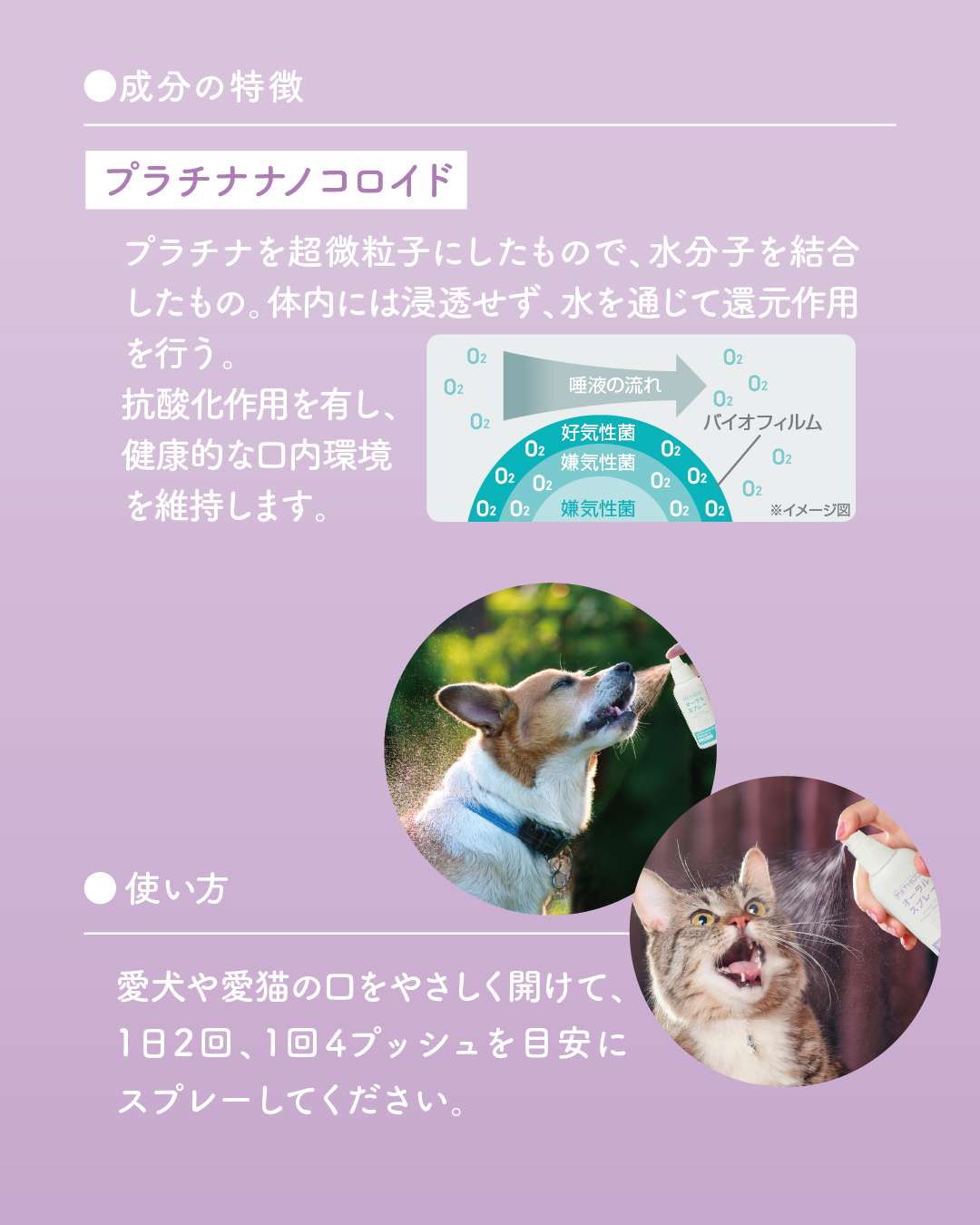 使用方法 | ペットの口をやさしく開けて、1日2回、1回4プッシュを目安にスプレーしてください。 |